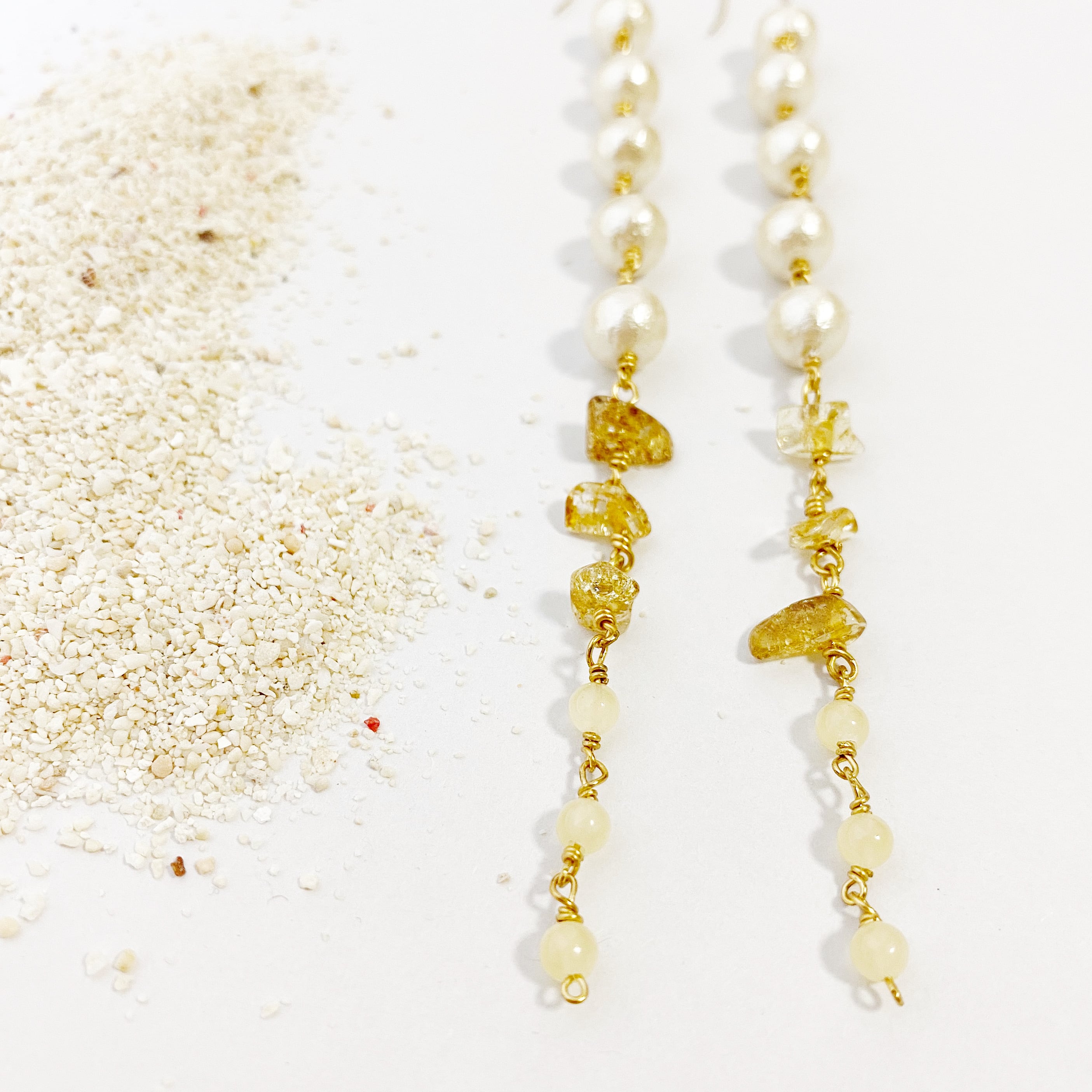 使用パーツ:14kgf 、ピアスフック以外の金属はメッキ、コットンパール、シトリン、ハニーストーン